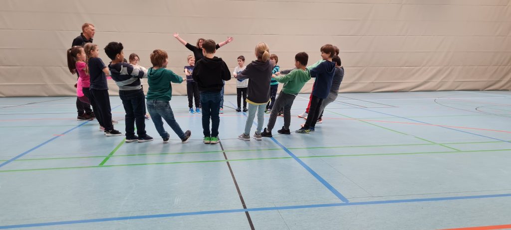 Anschließend wurde ein Laufspiel gespielt, bei dem immer eine „sichere Insel“ entfernt wurde bis schließlich nur noch eine Insel übrig war. Die ganze Klasse hat es geschafft, dass jedes Kind einen Fuß auf der sicheren Insel hatte. Der Jubel war groß.