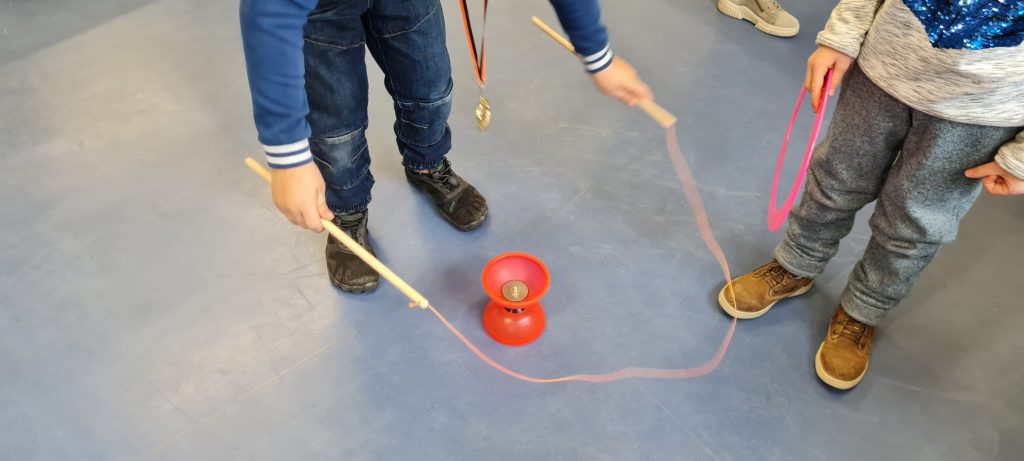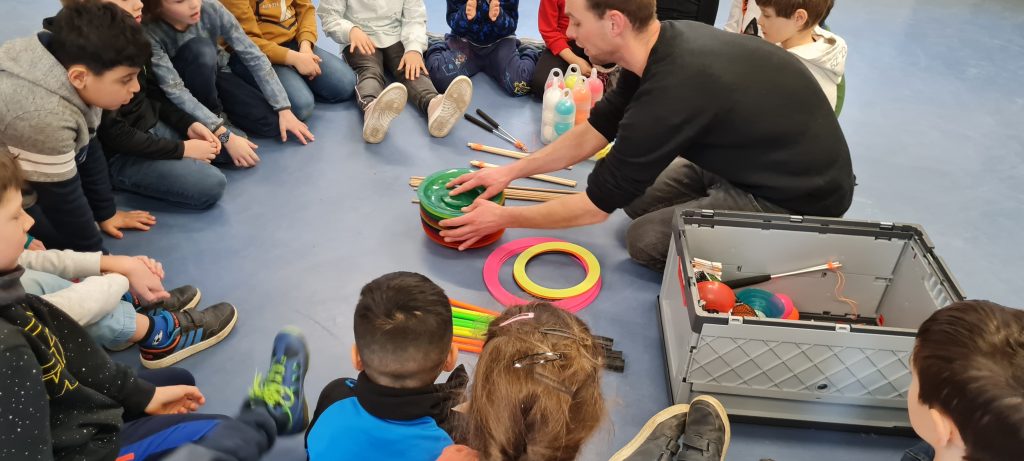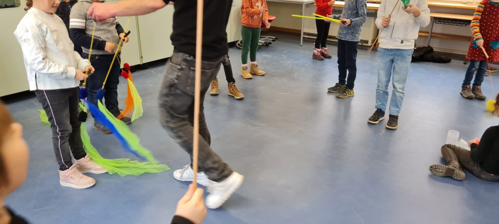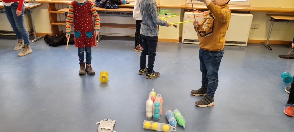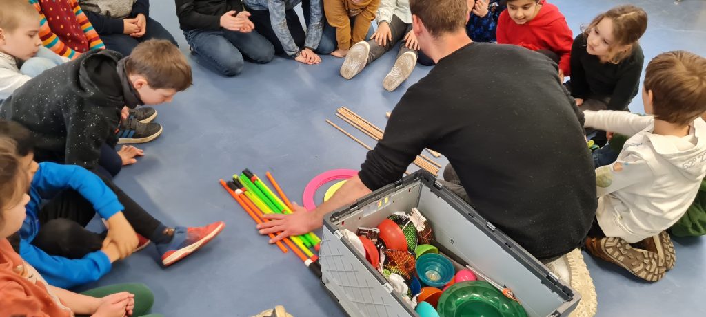 Mit Hilfe verschiedener Spiele und Übungen wurde die Ziele weiter vertieft und gefestigt. Die Schüler machten sehr gut mit und durften am Ende die Zirkusmaterialien vom Trainer ausprobieren. Sie hatten viel Freude an den verschiedenen Jonglier- und Wurfgegenständen.