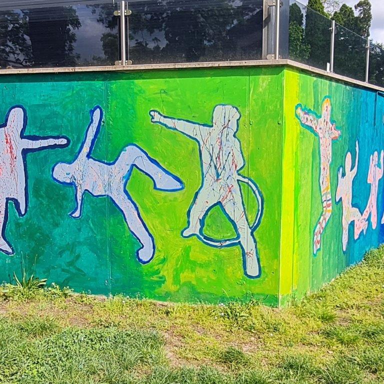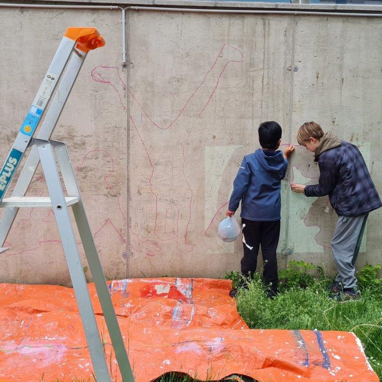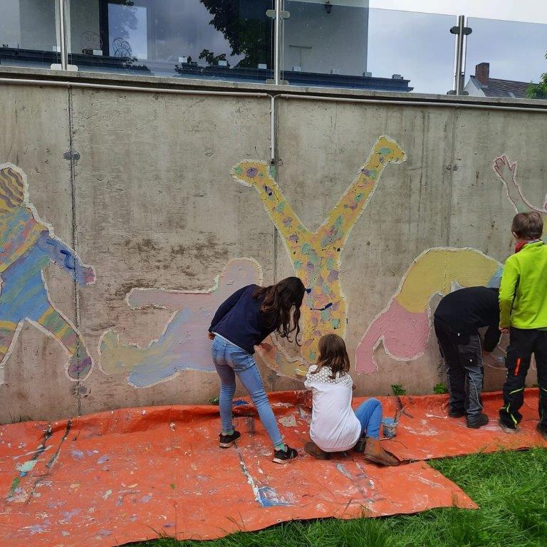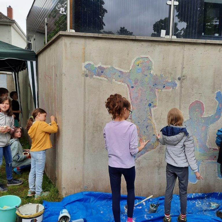 So konnte am Freitag der Hintergrund mit leuchtenden Farben bemalt werden bzw. an der anderen Mauer zunächst die Figuren und anschließend der Hintergrund.