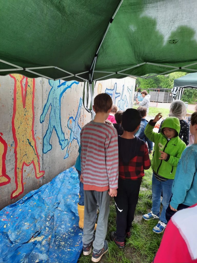 Leider hatten wir Startschwierigkeiten mit dem Wetter, Aufbau von Pavillons, fehlender Farbe, was aber die Freude der Schüler nicht trübte. Im Gegenteil, voller Tatendrang war der erste Teil der Mauer am Donnerstag fertig und beim 2. Teil bereits die Figuren abgeklebt.