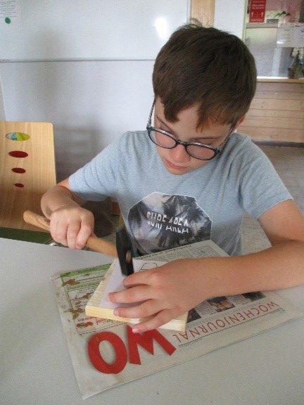 Zuerst mussten wir ein Brett zurechtschleifen. Dann suchten wir uns ein Bild aus. Es gab zum Beispiel Muscheln, Pfoten, Kleeblätter, … Anschließend hämmerten wir das Bild mit Nägeln nach und wickelten die Wolle um die Nägel. Die Wolle gab es in verschiedenen Farben.