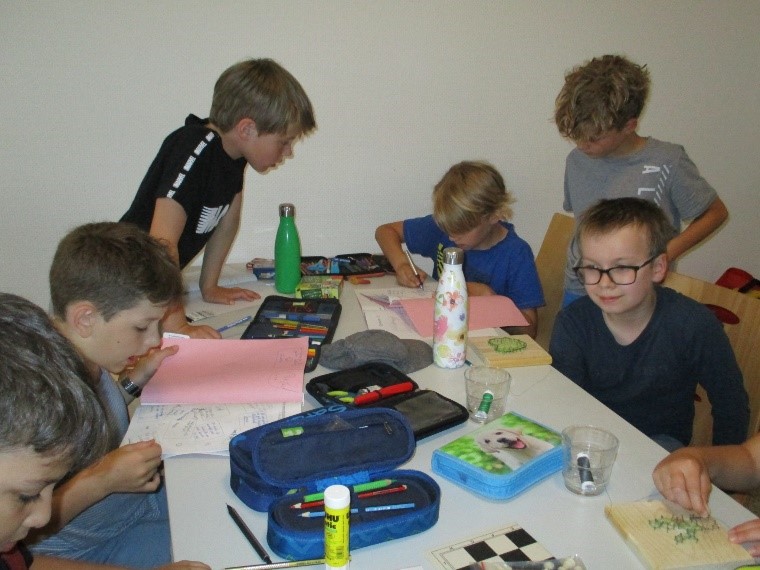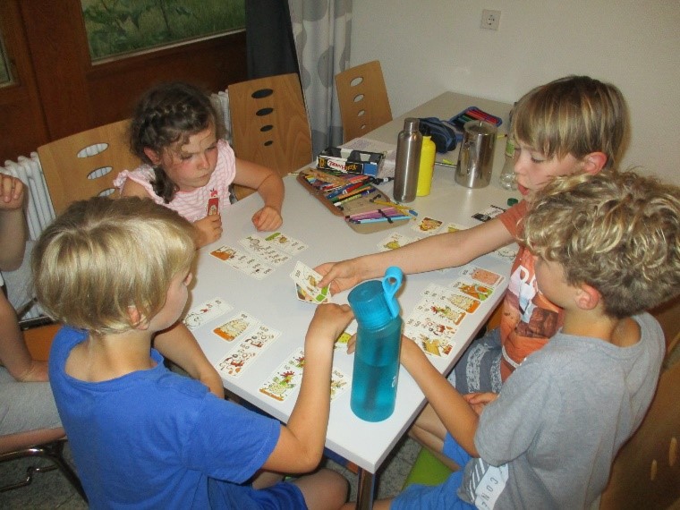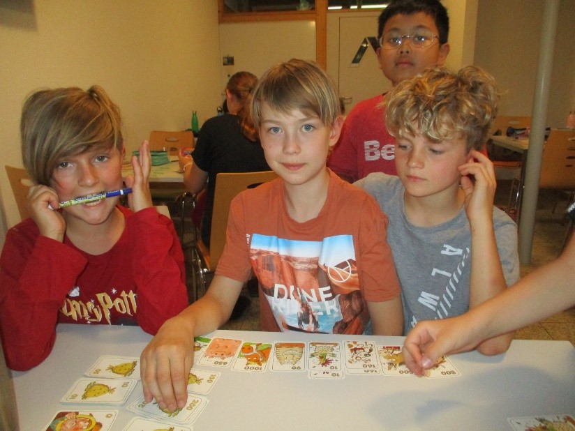 Am Dienstagabend haben wir einen Spieleabend gemacht. Jeder hat ein Spiel von zu Hause mitgebracht. Im Schlafanzug und mit Spiel gingen wir in unser Waldzimmer, unseren Gruppenraum. Frau Wolf hatte Snacks für uns dabei. Ben und Hannes und Frau Wolf haben „Kuhhandel“ gespielt. Noah K. und Andre haben Schach gespielt. Noah B. hat gegen Max und Rasyid „Mankomania“ gespielt. Linus hat mit Ben und Noah B. Karten gespielt. Toma hat gegen Celine und Aleksandra und Leila Schach gespielt. Noah K., Andre, Luisa und Frau Thometzek, Théo und Leila haben „Skyjo“ gespielt. Lucia hat bei Schach zugeschaut.