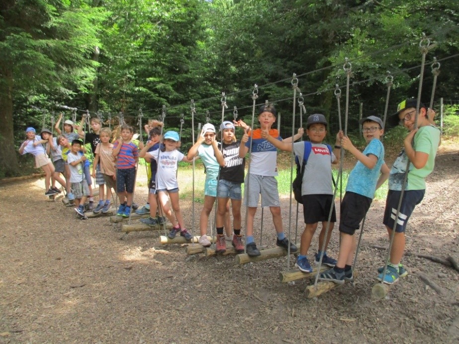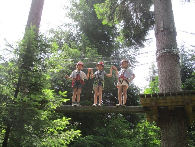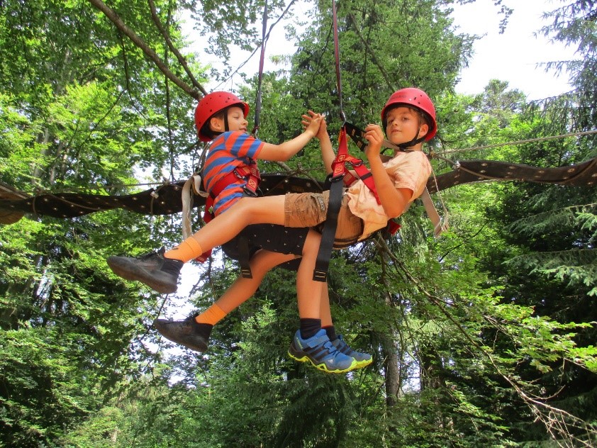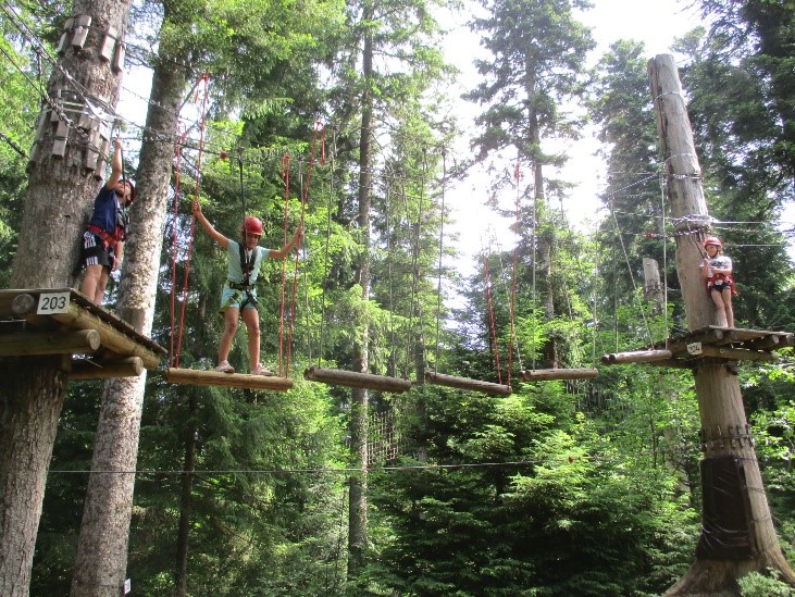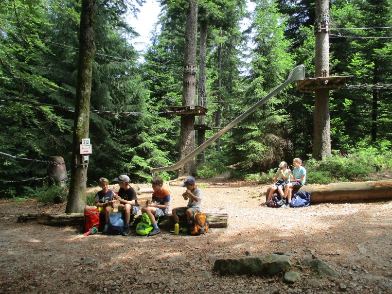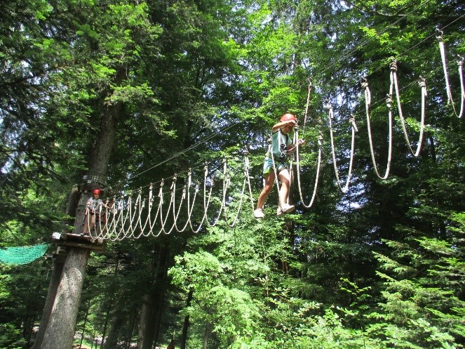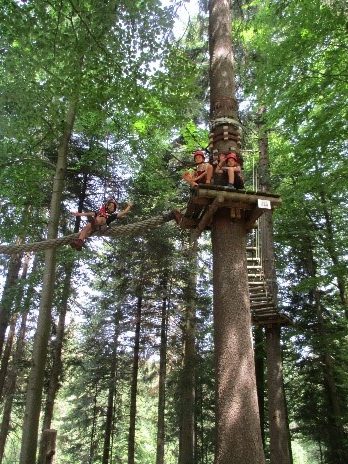 Nun ging es zum Kletterpark zum Klettern. Man konnte sich zwischen zwei Routen entscheiden. Das hat sehr viel Spaß gemacht. Die Route 2 fing mit zwei gespannten Stahlseilen an. Anschließend ging es mit Hängebrettern weiter. Danach ging es zu einer hingehängten Leiter. Zum Schluss gab es noch eine steile Rutsche!