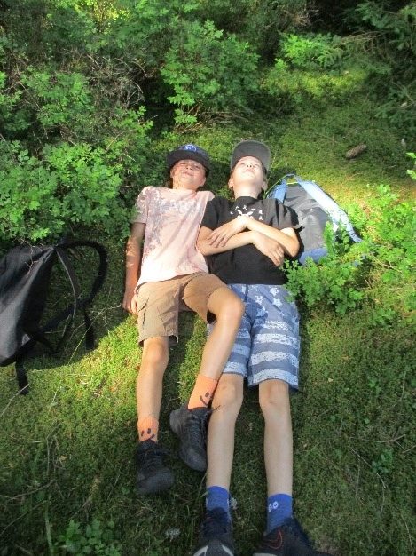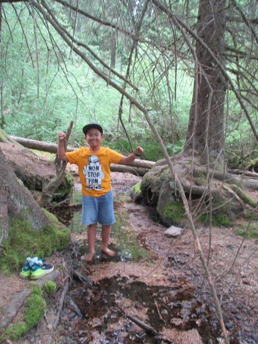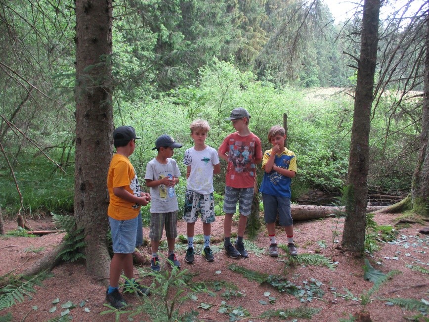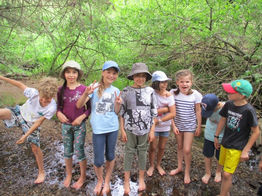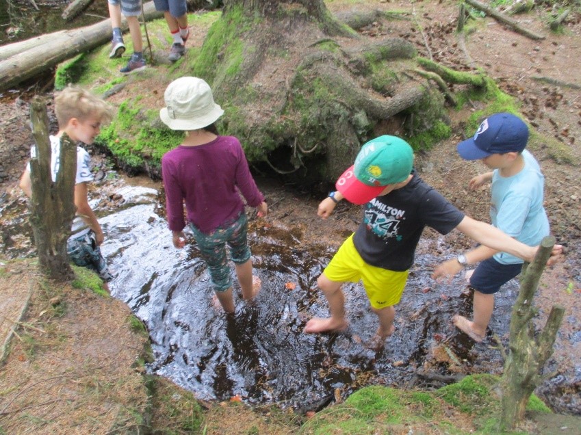 Wir durften öfter in Bäche hinein. Bei der Suche für die Bastelsachen für unsere Mandalas mussten wir sogar über einen Bach springen! Im Wasser hat es immer sehr viel Spaß gemacht. Deswegen blieben wir immer eine Weile drin. Das Wasser war eine tolle Erfrischung bei der Hitze!
