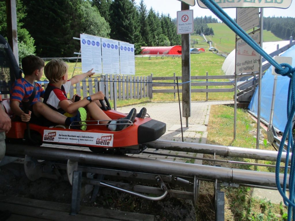 Nach dem Klettern war die Bobbahn dran. Wir haben Tickets bekommen und mussten sie in eine Art Maschine reinstecken. Bei manchen hat es nicht geklappt. Auch Frau Wolf hat beim Fahren mitgemacht. Wir sind über 40km/h gefahren. Zwei Personen sind fast in vier weitere reingefahren. Es hat am Ende sehr viel Spaß gemacht.