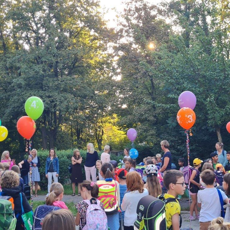 Alle Schüler versammelten sich auf dem Schulhof und stellten sich vor die Luftballons mit ihrer Klassenzahl.