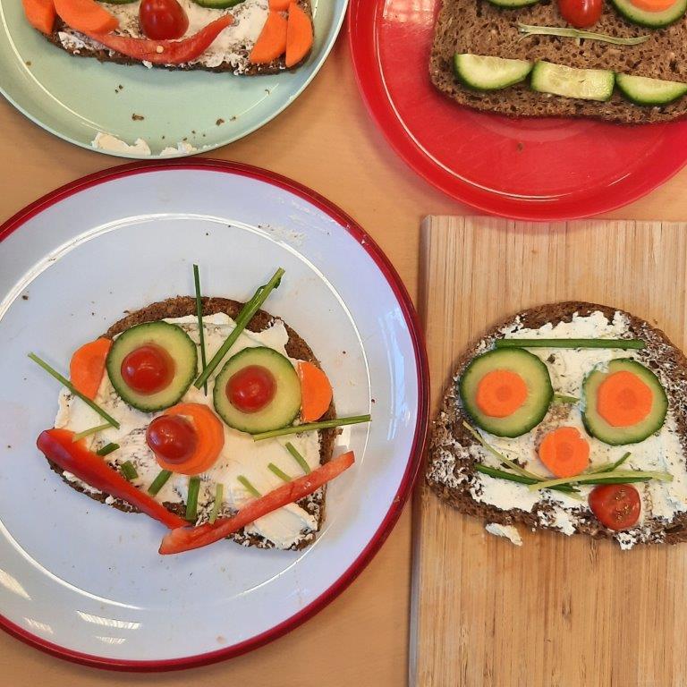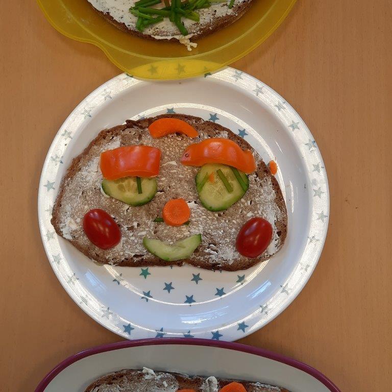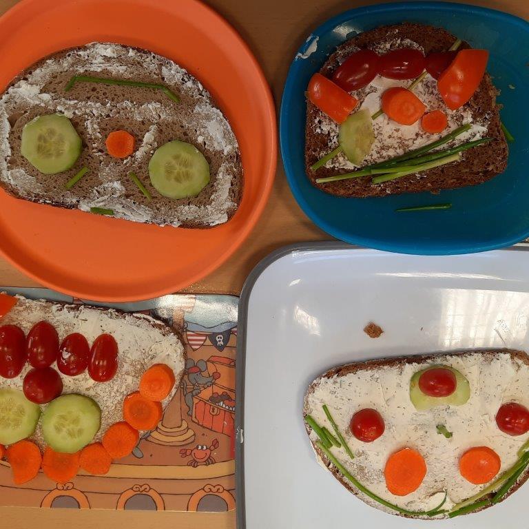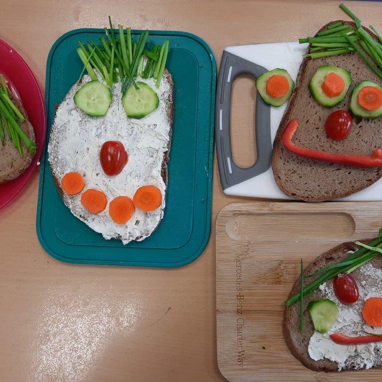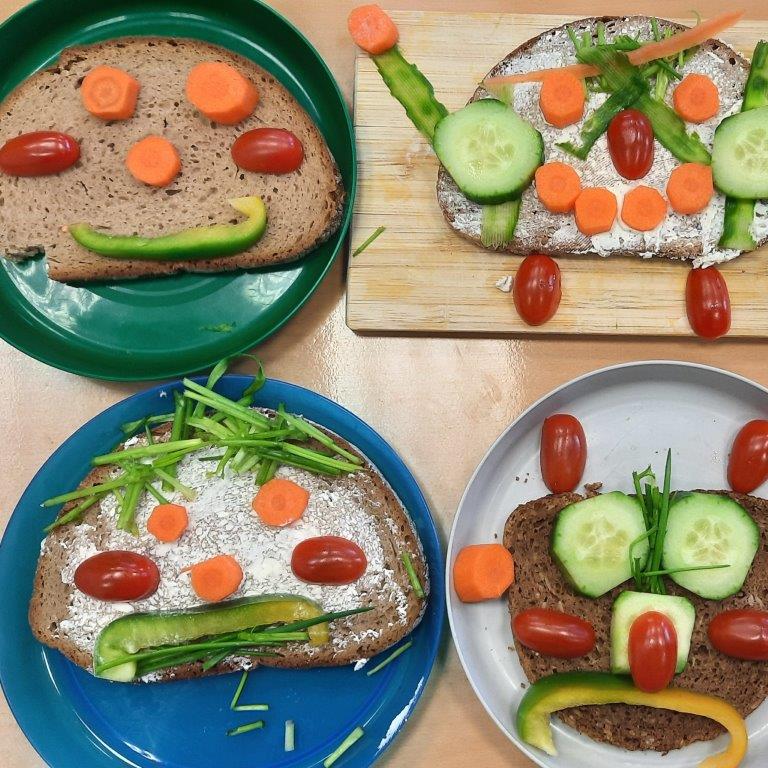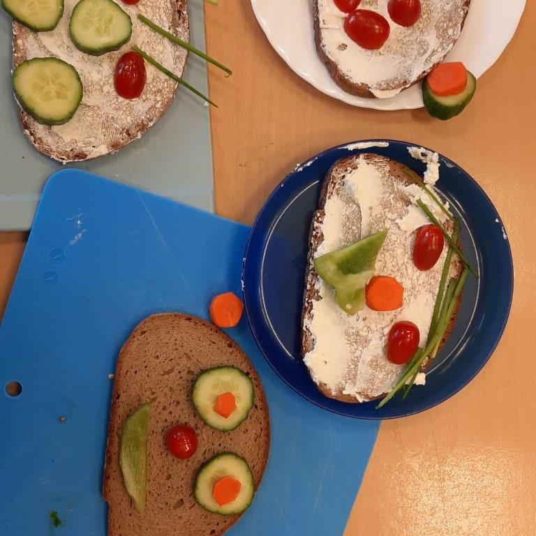 Im Rahmen des Ernährungsführerscheins hat die Klasse 3b am Vormittag des 20. Dezembers 2023 es sich zur Aufgabe gemacht, lustige Vesperbrote zuzubereiten. In Kleingruppen hatten die Schülerinnen und Schüler die Aufgabe, Gemüse zu schälen und in mundgerechte Stücke zu schneiden, um anschließend ihre mit Frischkäse bestrichenen Roggen- oder Dinkelbrotscheiben damit zu belegen. Entstanden sind am Ende lustige Menschengesichter mit Schnittlauchhaaren, Paprikamündern, Mäuseköpfe mit Tomatenmündern und Gurkenohren oder Eulen mit Karottenschnäbeln. Die Brote schmeckten somit nicht nur lecker und waren gesund, sondern sahen obendrein noch wunderbar lustig aus.