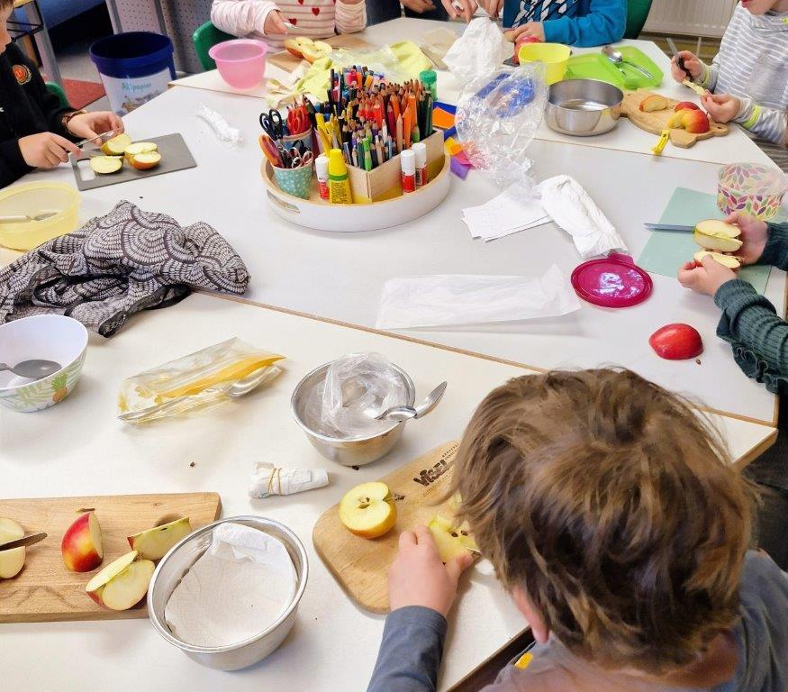 Alle Kinder haben erfolgreich das Kerngehäuse entfernt und ihren Apfel in kleine Stücke geschnitten und beinahe wie von selbst war dann das Apfelmus zum Probieren nach der zweiten Hofpause fertig.