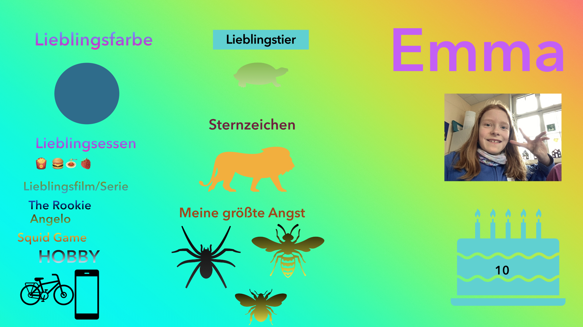 Mit viel Fantasie, bunten Farben und passenden Bildern haben sie Folien gestaltet, auf denen sie etwas über sich erzählen: Lieblingsessen, Hobbys, Haustiere, Lieblingsfarben und vieles mehr.