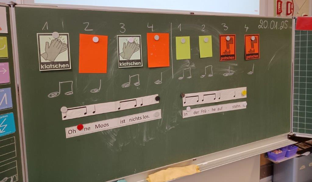 Mittlerweile können wir schon verschiedene Noten lesen, schreiben und spielen. Wir haben einen Klassenrap aufgenommen und als Glockenspielorchester sind wir spitze! Am liebsten tanzen wir gerade Tanzchoreografien nach. Gut, dass kein Klassenzimmer unter uns ist. 😊