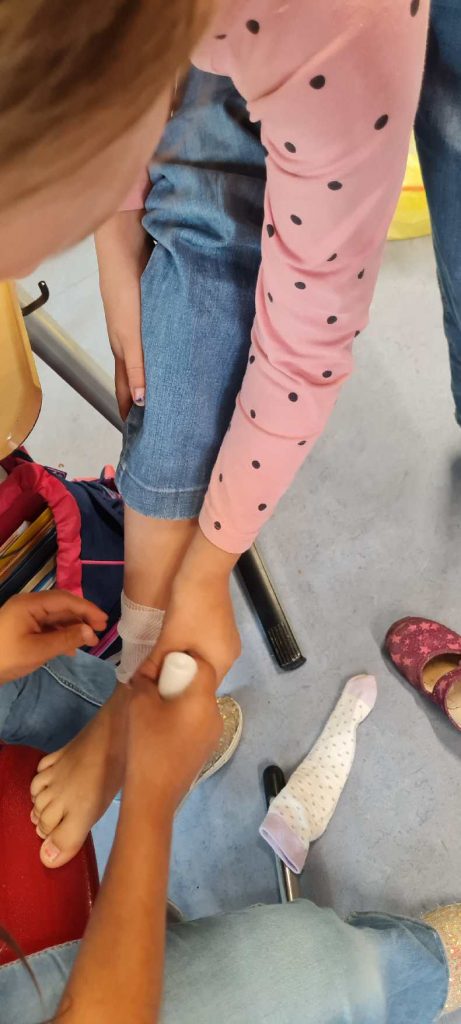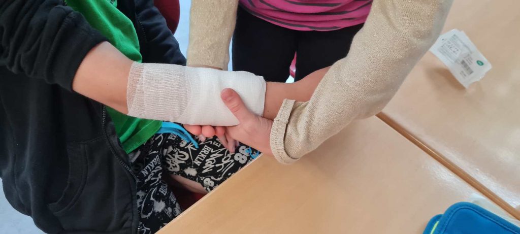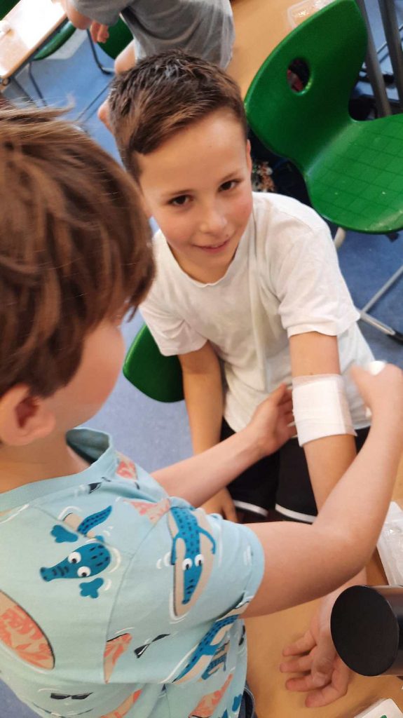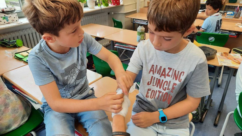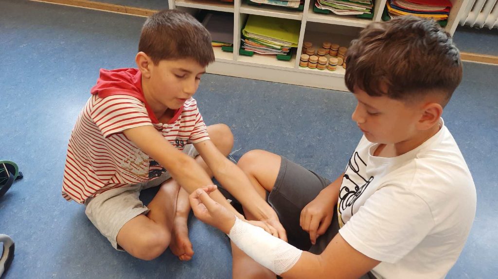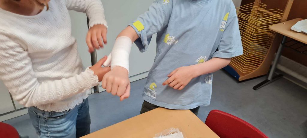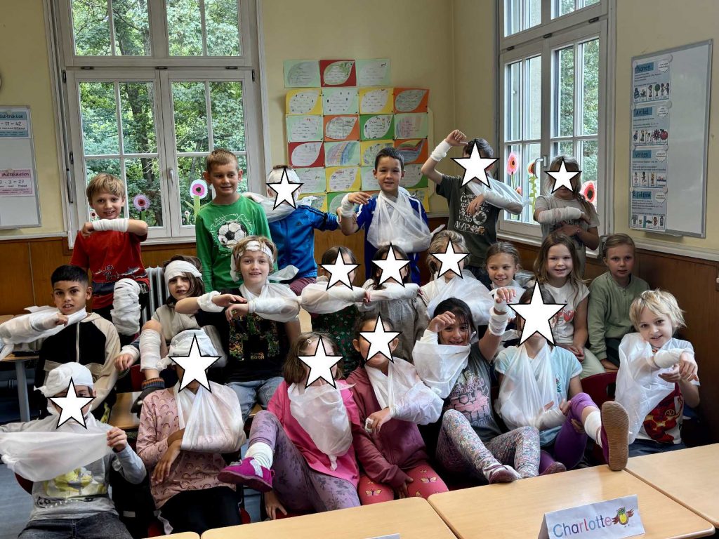 Am Dienstag, 8.7.2025 haben alle Kinder aus der Eulen-Klasse einen Erste-Hilfe-Kurs gemacht. Kilian hat uns gezeigt, wie man Verbände anlegt. Schließlich haben wir uns immer zu zweit gegenseitig Verbände umgebunden.