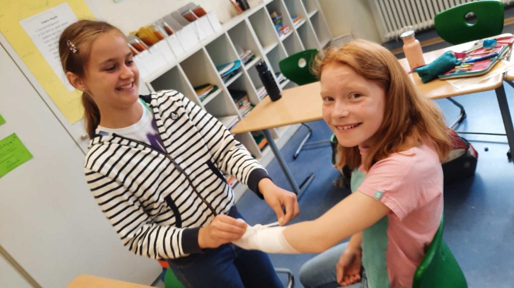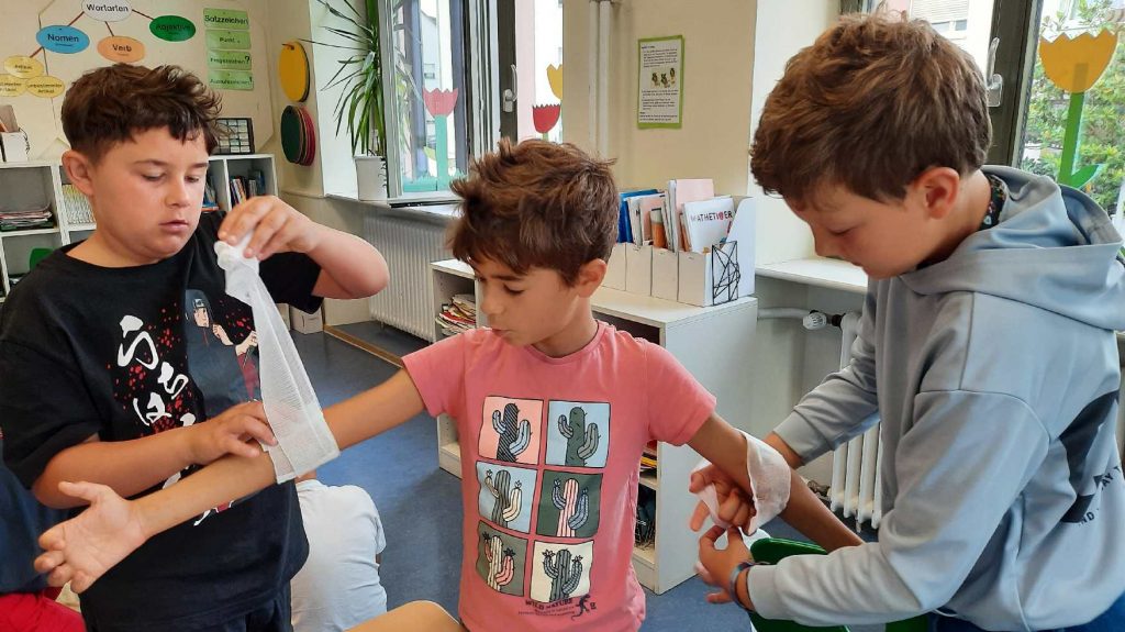 Im Juli 2025 fanden im Rahmen des Präventionsprojekts „stark.stärker.WIR.“ Erste-Hilfe-Kurse in allen acht Klassen statt. Die Kinder lernten beispielsweise, wie man an verschiedenen Körperstellen einen sauberen Verband anlegt oder auch wie man verletzte Personen in einer Notlage anspricht und sich bemerkbar macht, um Hilfe und Unterstützung von Anderen zu erhalten. Die Kinder der 4. Klassen lernten sogar, wie man eine bewusstlose Person schrittweise in die stabile Seitenlage bringt. Dabei nahmen die Lehrerinnen ihre Schülerinnen und Schüler als sehr motiviert und wissbegierig wahr. Der ASB (Arbeiter-Samariter-Bund) bietet nicht nur Erste-Hilfe-Kurse an, sondern ist unter anderem auch im Katastrophenschutz tätig, setzt sich in der Alten- und Krankenpflege ein oder bietet Kurse für Erste Hilfe am Hund. Neben all dem neuen Wissen, das den Kindern praxisnah vermittelt wurde, gab es auch immer wieder lustige Momente zum Schmunzeln; es erweckte den Eindruck, als wäre ein wild gewordener Löwe im Klassenzimmer gewesen, als plötzlich alle Kinder einer Klasse mit verbundenen Armen, Knien, Ellenbogen oder Köpfen auf den Pausenhof marschierten.