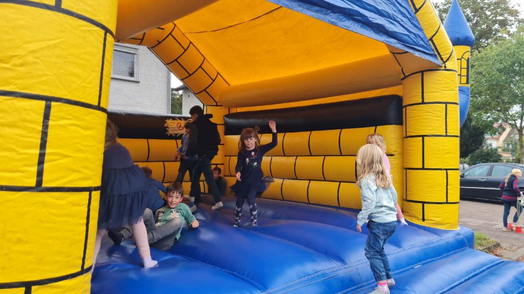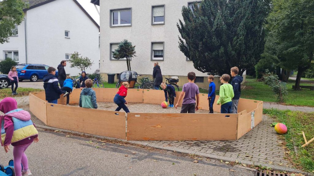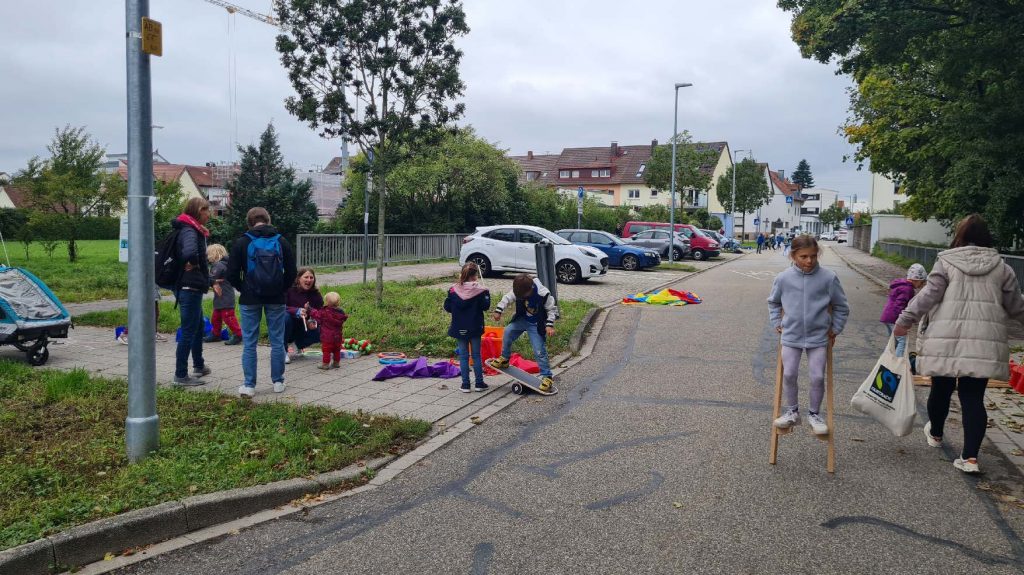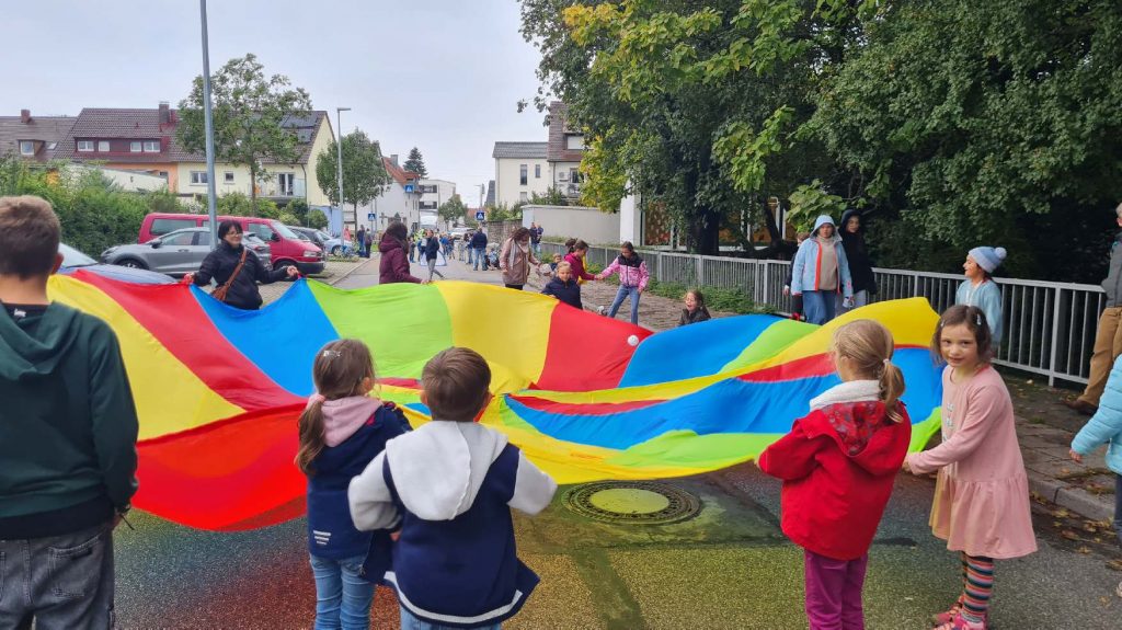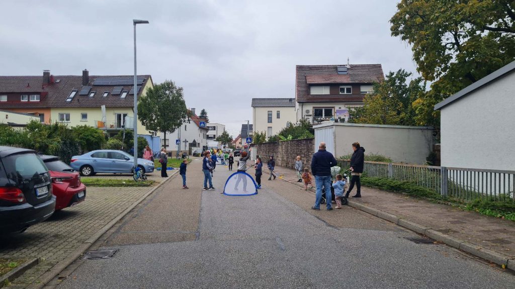 Die Julius- Bender Str. Ecke Ruschgraben bis Ecke Schäferstr. war von 15.00 bis 18.00 Uhr für den Straßenverkehr gesperrt und verwandelte sich in eine Spielstraße, in der man in der Hüpfburg toben, Hockey oder Wilson Ball spielen, aber auch mit vielfältigen Kleingeräte wie Diabolo, Stelzen, Pedalos und vielem mehr aktiv werden konnte. Es gab aber auch „Platz“ für Gespräche, Austausch, Lachen oder mit Kreide malen.