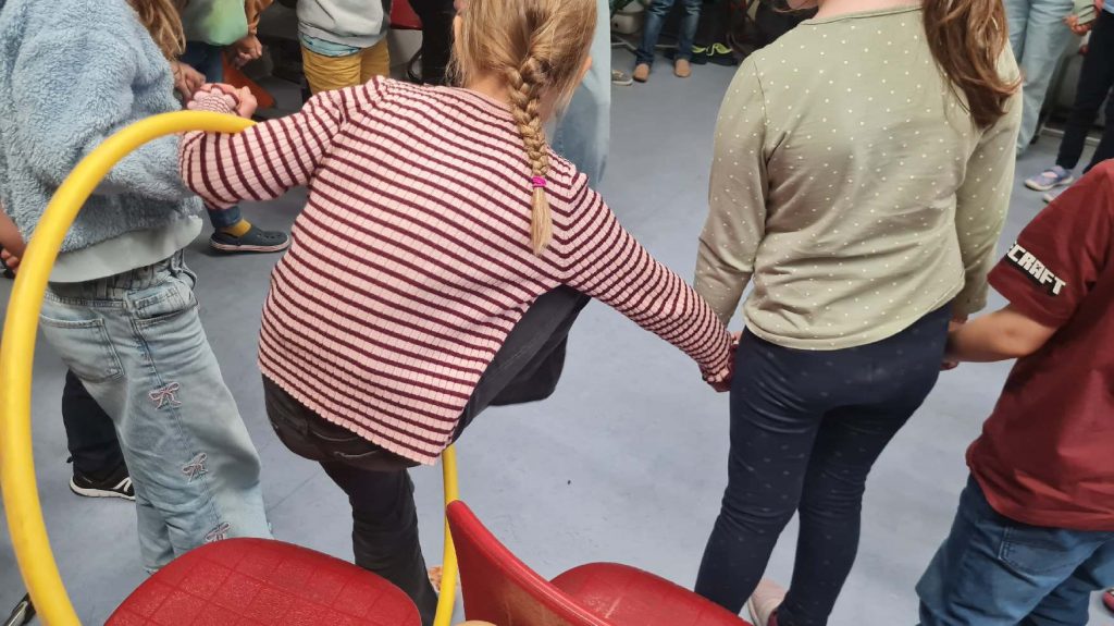 Als gemeinsamer Abschluss wurde ein Spiel gespielt: Alle Kinder hielten sich an den Händen und gaben einen Reifen von einem zum anderen weiter – ohne loszulassen. Dabei zeigte sich: Nur gemeinsam kann man solche Aufgaben meistern.
